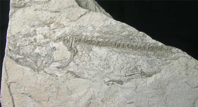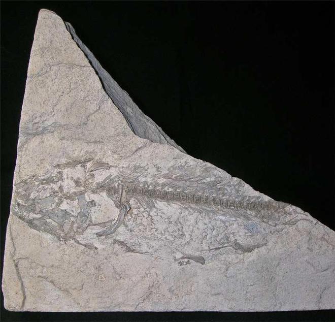 | This specimen was purchased many years ago in an auction in Dorset. Preserved is an extremely rare, bony fish on a piece of Portland limestone. The specimen exhibits very sharp teeth and has a very well defined back bone with ribs protruding from each vertebra. An exceptionally rare piece - one for the collector of unusual and exceptional British fossils!! |