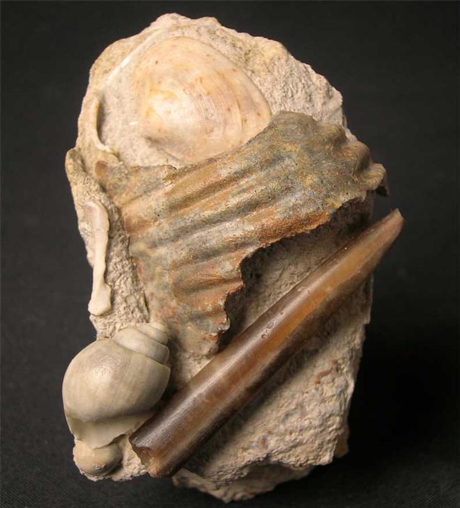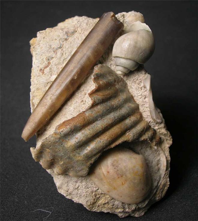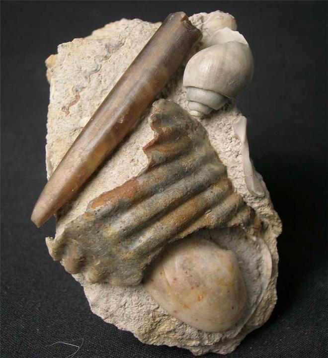| This beautiful assemblage includes a Gastropod,Belemnite, Bivalve and ammonite fragment. These multi specimens are a snapshot of the sea floor some 167 million years ago and with careful preparation can reveal exquisite detail such as this fossil. Becoming increasingly rare thesedays. |