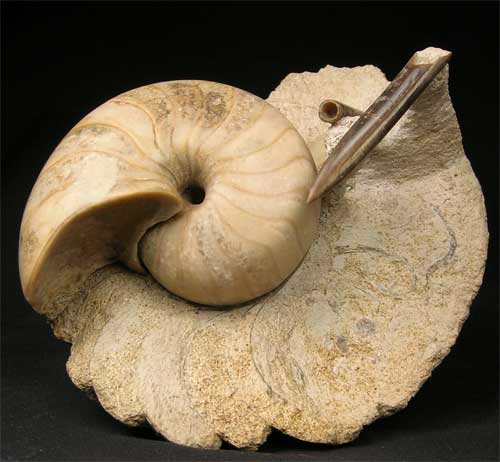 | This marvellous piece of preparation work was carried out by Andy Cowap and commanded many many hours of painstaking work. Only very few fossils of this calibre are seen on the open market for sale. This superb fossil is not only a one off unique item but is a very good investment for the future. This particular fossil locality is no longer accessible to collect, hence their rarity. Approximately 167 million years old. Both the Nautilus and the Belemnite Rostrums are solid calcite. This one is for the serious collector of very fine fossils. Extremely rare. |