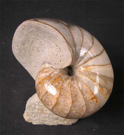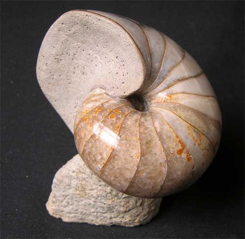 | Many hours of preparation has gone into this marvellous nautilus from England's Jurassic coast. The outer shell of the nautilus has been ground off to a gem smooth finish to reveal the internal chambers, then a professional polish applied for maximum aesthetics. The nautilus is solid calcite and has many beautiful colours. There is a small piece of matrix which the nautilus lies on for ease of display. Approximately 167 million years old. A superb and rare fossil. |