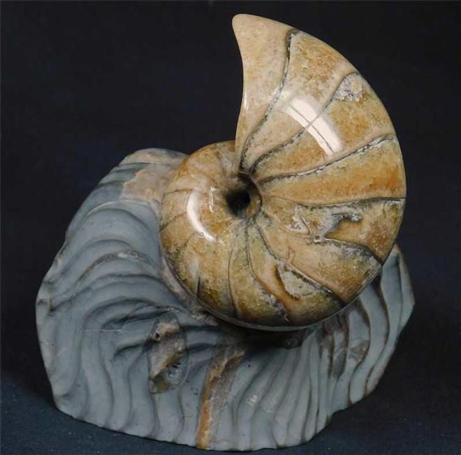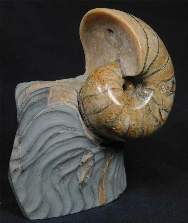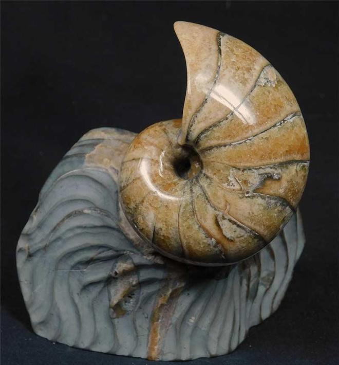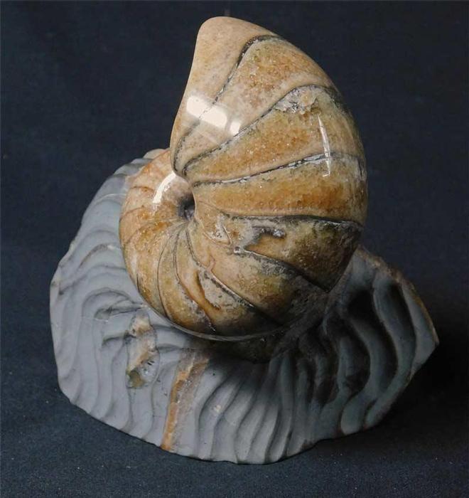| This is probably one of the finest Nautilus that we have ever seen from this seldom collected bed that occurs at Lyme Regis. The nautilus has been carefully ground down and then a high polish applied to reveal stunning honey coloured calcite chambers. The surrounding matrix also has been aesthetically worked to add to the overall beauty of this specimen. The specimen has a flat base for ease of display. An exceptional Lyme Regist nautilus, one for the discerning collector. |