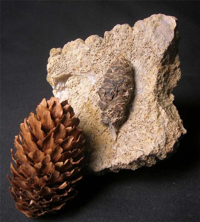 | An exceptionally rare fossil from the oolite of southern Britain, a wonderfully preserved fir cone. The cone has been fully prepared by Andy Cowap and has taken many painstaking hours to get to this state. The fir cone even has the stalk which attaches it to the branch preserved. Only a few of these cones have ever been discovered, fi/pine cones from the UK are excessively rare and this one is sublime and a real collectors piece. Approximately 171 million years old. A rel fir cone as seen in the main picture is a lovely accompaniment with the fossil and how they haven't changed in all those millions of years !! |