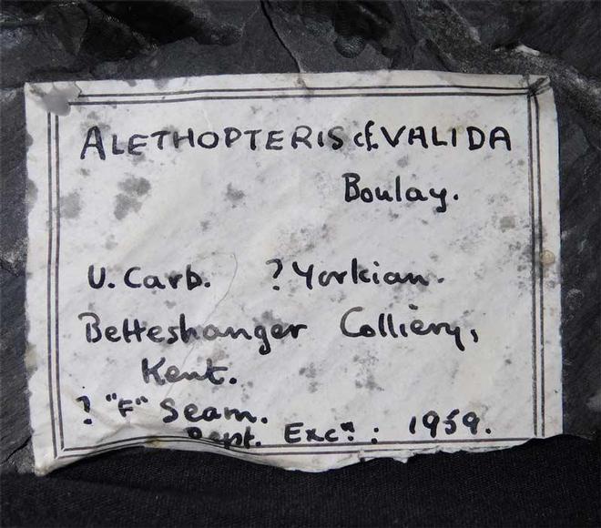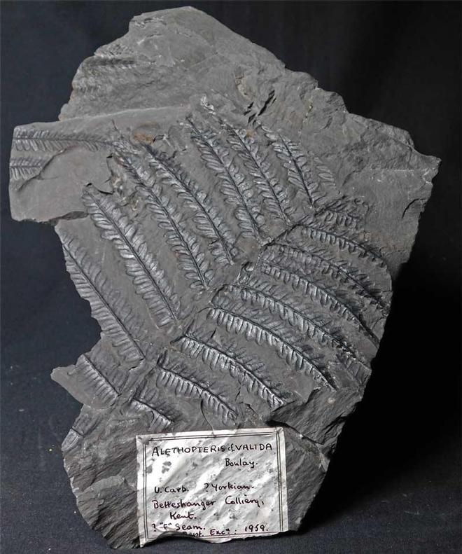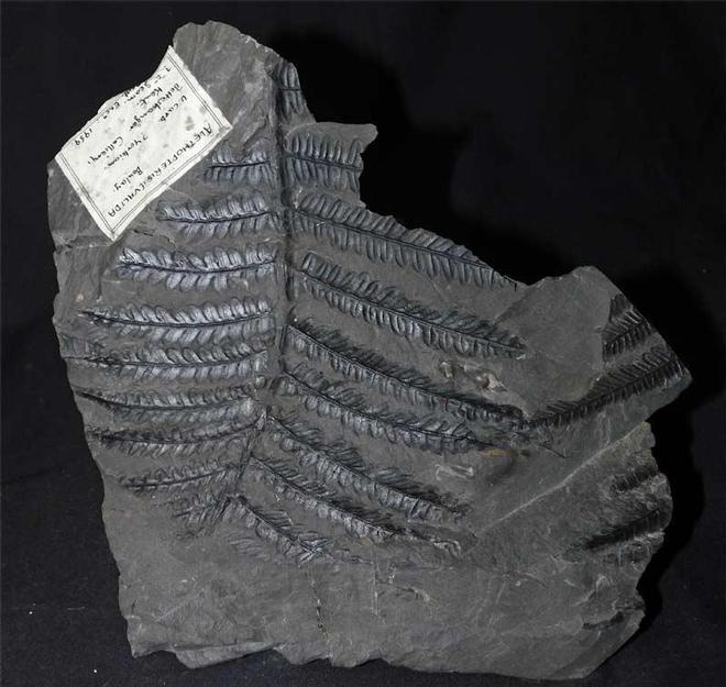 | This really nice and dramatic example is approximately 320 million years old. The detail on each leaf (pimule) is fantastic, especially under magnification. This colliery was the biggest in Kent. This specimen, according to the coal seam was discovered 1,476ft below the surface. This fine specimen was found in 1959 and was used as a display item in the colliery exhibit area. The colliery closed in 1989. The fossil resided in the late GORDON WALKDEN collection. |