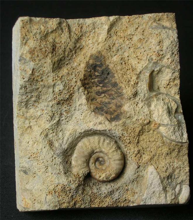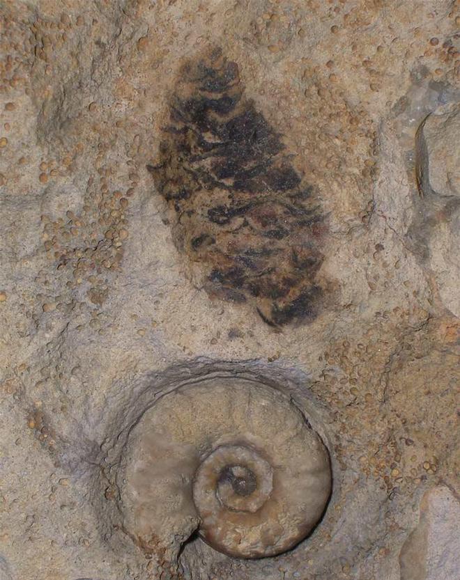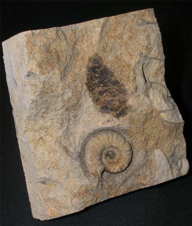 | Although this cone is most the negative, there are dense patches of clear seed which under magnification are superb in detail. Fir cones from the Oolite are extremely scarse and only a handful are known. This fine specimen was discovered in a temporary exposure in 2001. Next to the cone is an ammonite, Sonninia (euhoploceras) acanthodes. The matrix has been shaped to fit into a collectors drawer. A real one off fossil which is approximately 171 million years old. |