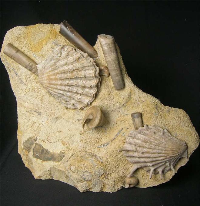 | These two spiny clam shells are amazing with their intricate detail. Also on the same piece lies a Gastropod (Pyrgotrochus elongata, J.Sowerby) three Belemnites (Megateuthis ellipticus, MILLER) and two ammonites (Otoites & Sonninia sp). Multi fossil specimens such as this incredible piece take many hours of careful preparation. The matrix has a level base for upright display. The fossil was discovered in 2011 during a temporary exposure. One for the serious collector of aesthetic fossils from the United Kingdom. Approximately 171 million years old. |