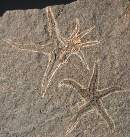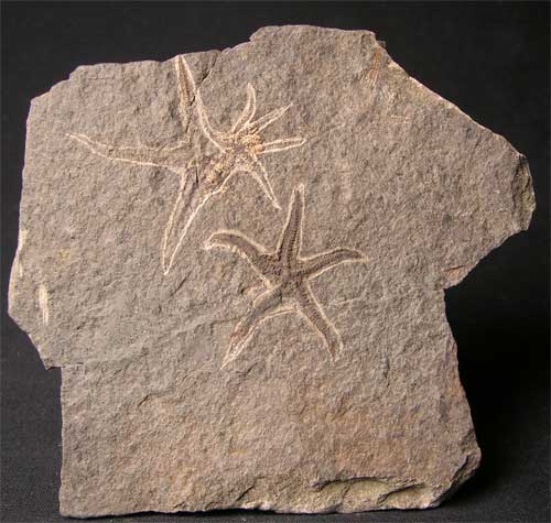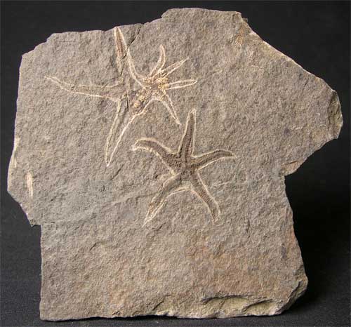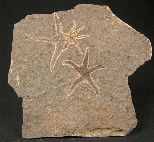 | Starfish from this early period in time are rare and this specimen contains two species of starfish which alone is excessively rare. This specimen is from the late John Page collection and is from the world famous starfish beds of Girvan. This is a must for any serious collector. |