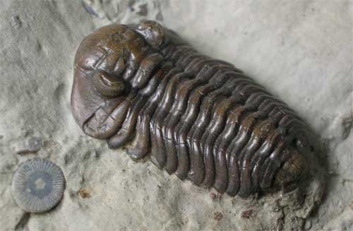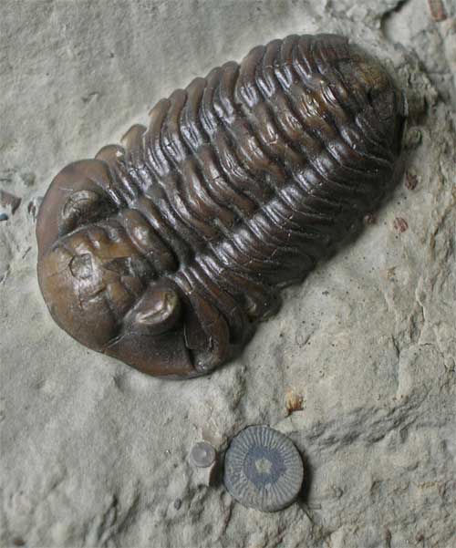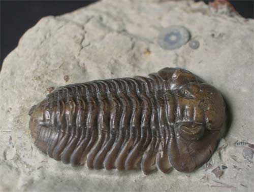 | An absolutely stunning example of this classic Wenlock trilobite. The specimen is preserved in dark brown calcite and has been prepared so that the specimen shows all aspects. The eyes are particularly wonderful. Quite a stunning example. |