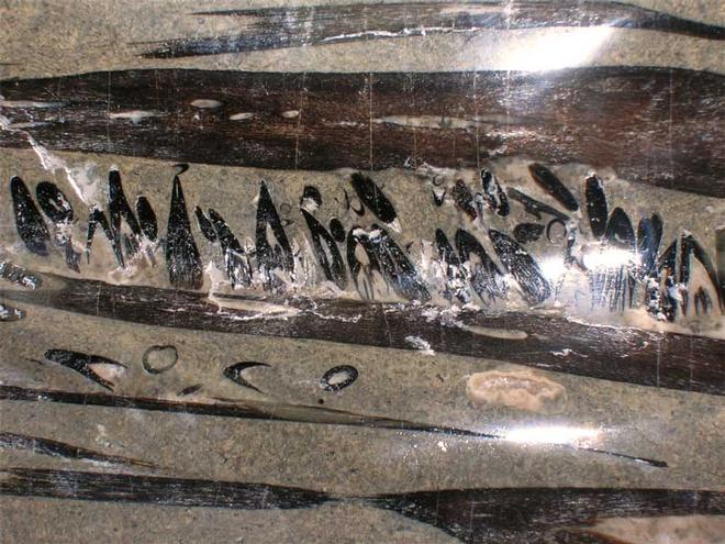 | This is probably the only specimen that has been ground and polished along the full length of the Ichthyosaur skull. The specimen was collected in the late 60's and could not be prepared either mechanically or with the modern acid preparation techniques. This piece exhibits the full length of the jaw with its teeth and even the vertebrae at the back of the skull have been sectioned and polished. We at Fossils Direct try to bring unique specimens to the marketplace and this is no exception ! A fantastic display specimen, educational specimen or even for someone looking for something a little different in their interior. The specimen is approximately 200 million years old. |