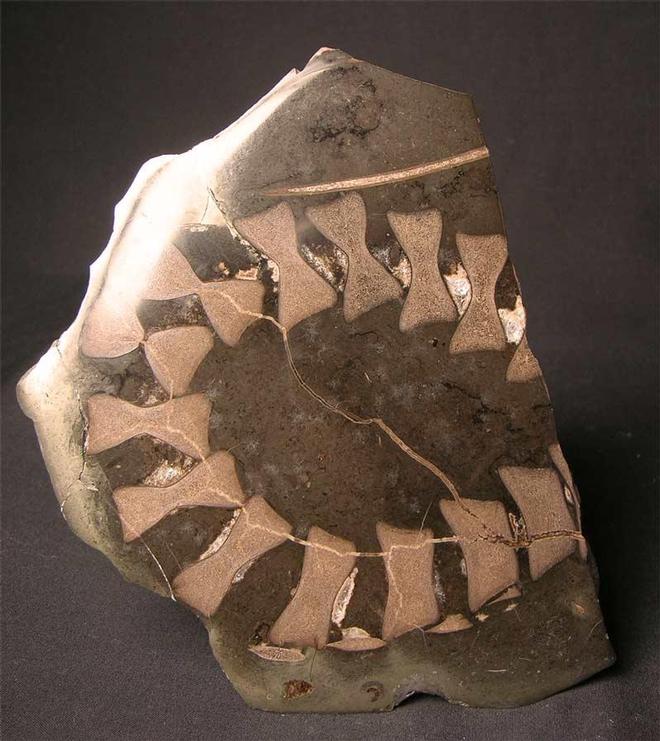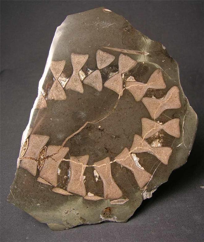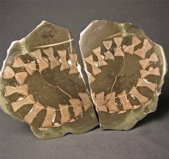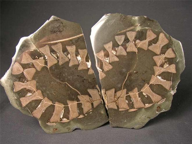 | From an old collection is this very fine and very asethetic Ichthyosaur specimen. The hard limestone nodule containing the Ichthyosaur vertebrae has been cut and each side has been ground down and a polish applied. The unique feature of this specimen is the curviture of the tail and when the two slices, as in the photographs, are put together, it resembles a bow tie!! A fabulous and unique bone specimen. |